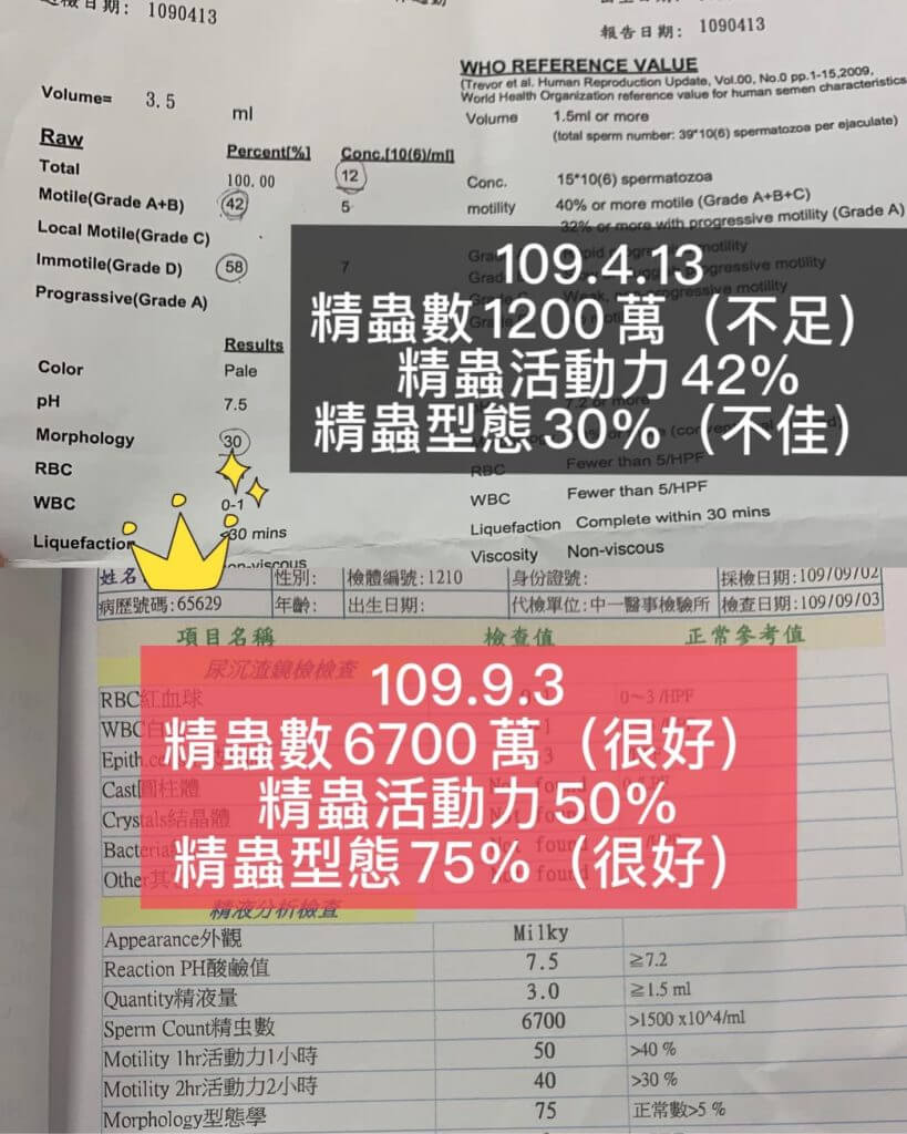 本文的案例原本濃度為 1400 萬/毫升,低於正常標準,調理後則增加為 6700 萬/毫升,增加幅度非常好,活動力也增加了。